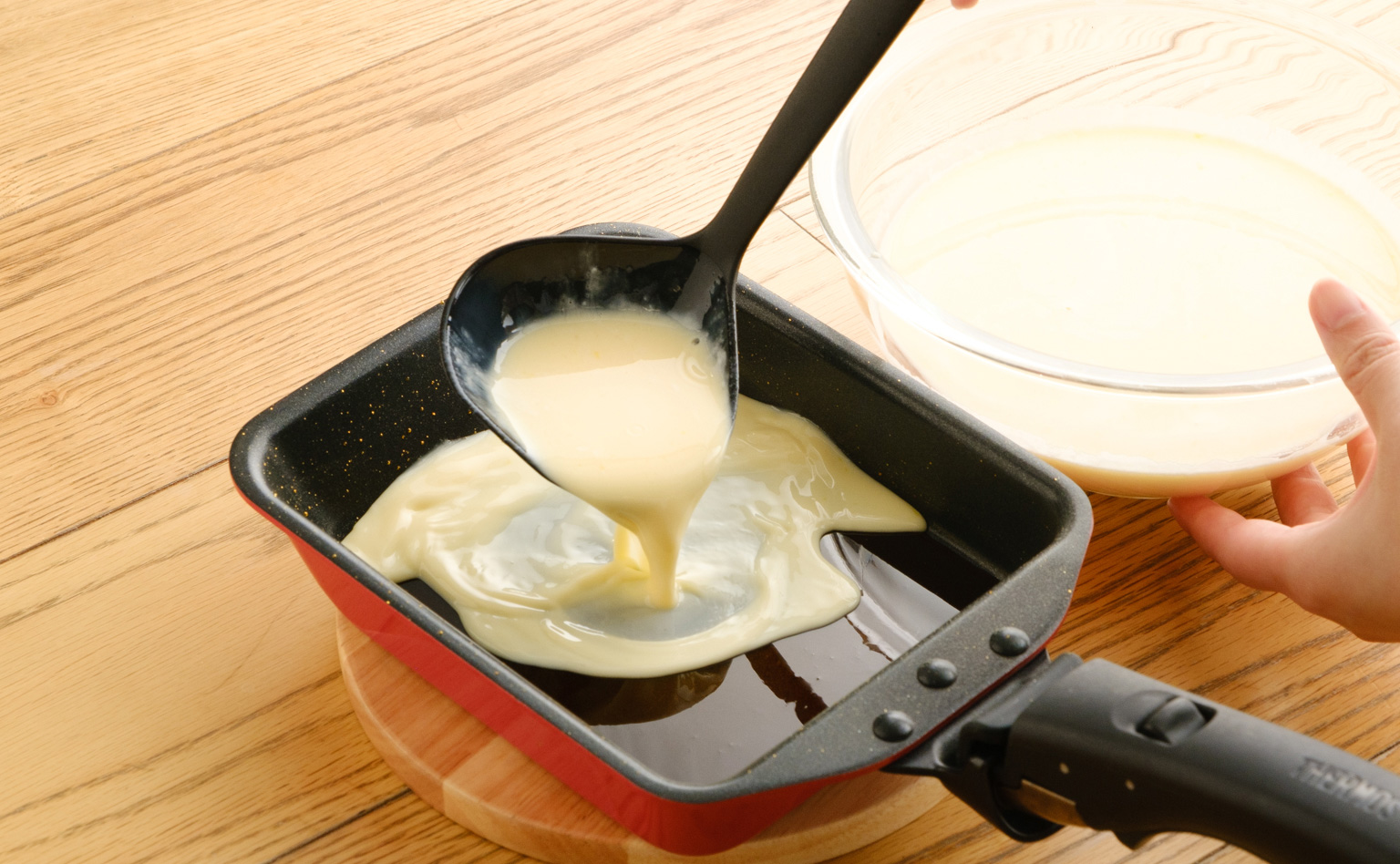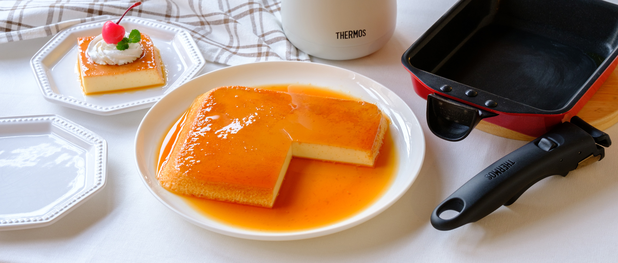 プリンはシンプルなレシピですが、いざ自宅で作ろうとすると意外と大変!プリンカップをいくつも用意しないといけなかったり、カラメルがこびりついて洗いにくかったり……。スイーツレシピが大得意なYuriさんが教えてくれるのは、サーモスの『デュラブルシリーズ 取っ手のとれる玉子焼きフライパンKEA』を使った昔懐かしい固めのプリンレシピです。