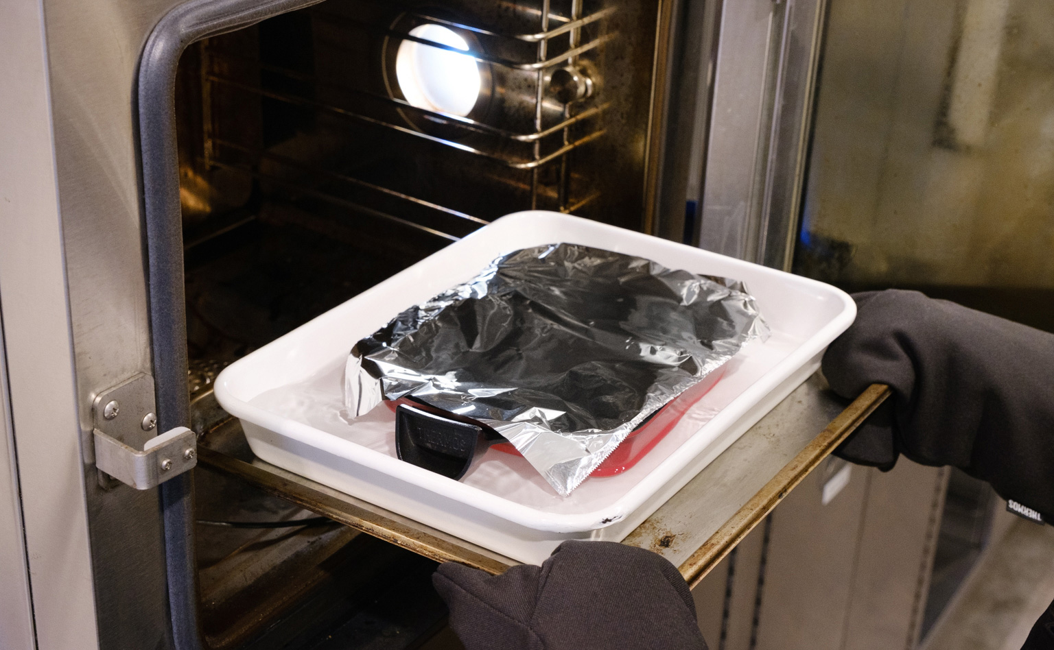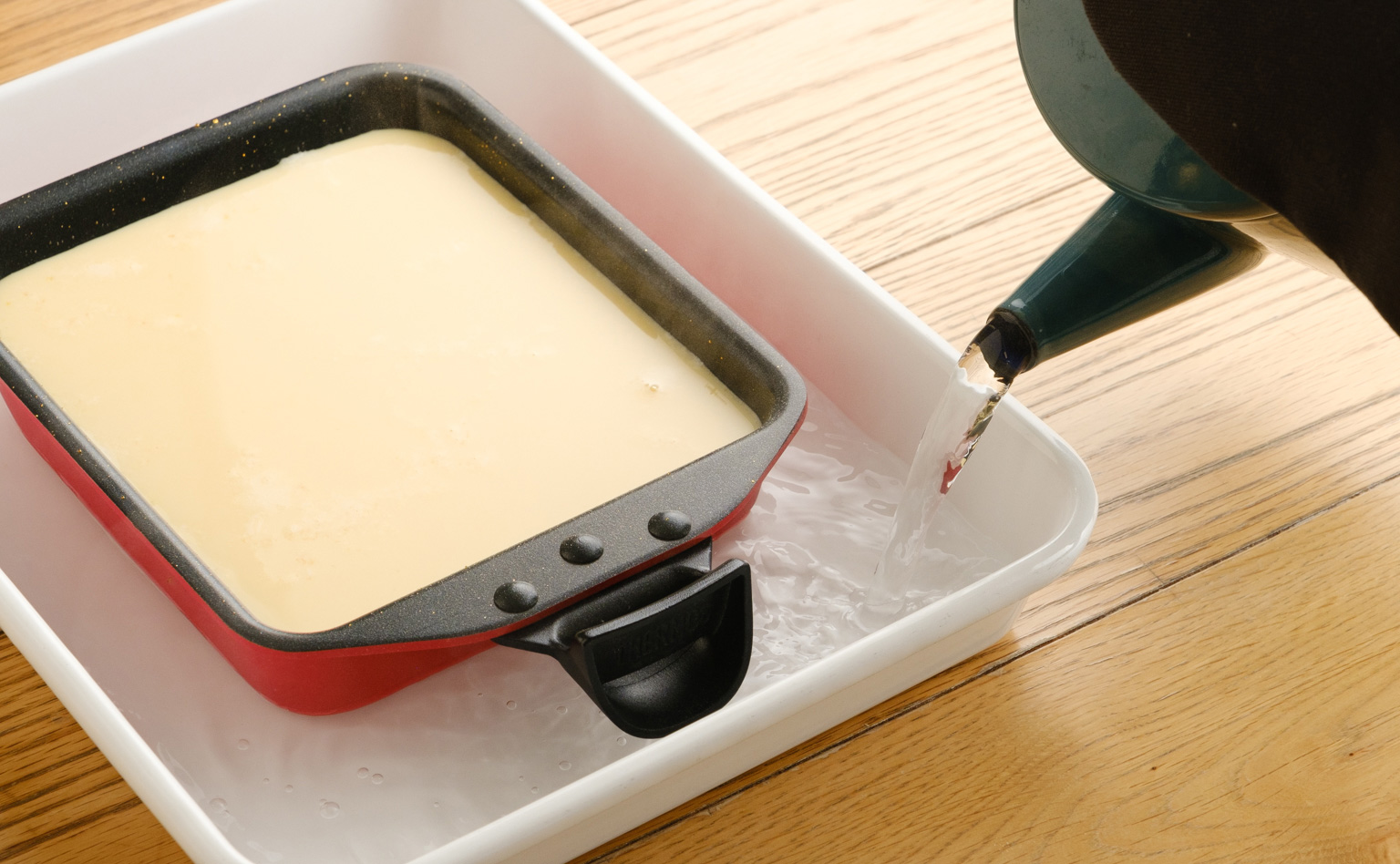 【6】【3】で冷ましたフライパンに【5】を注ぐ。一回り大きな耐熱容器に、取っ手を外したフライパンを入れる。フライパンの底から1㎝程度の高さまでお湯を入れ、アルミホイルをかぶせる。150℃に予熱したオーブンで35分湯煎焼きにする。
