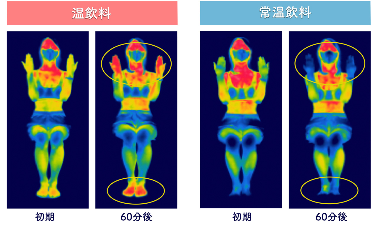 <調査条件>湯温 70℃の飲料水を 10 分おきに 60 分後まで 50 ㎖ずつ摂取した場合と、常温の飲料水を10分おきに60分後まで50㎖ずつ摂取した場合の体温を測定。測定環境28℃の室温で、女性被験者3名の体温を測定。結果には個人差があります。