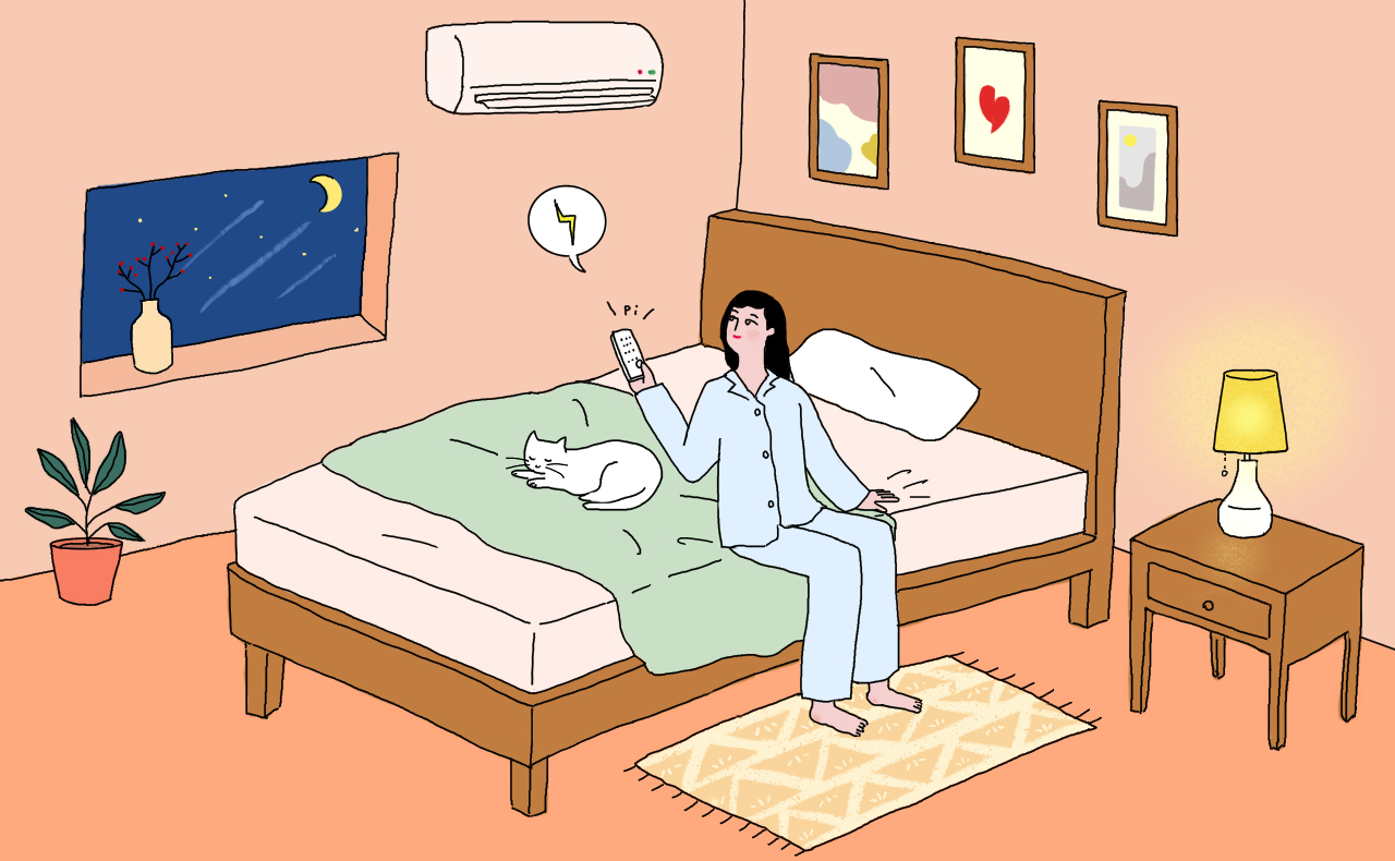 ……なのですが、せっかくお風呂で深部体温を上げても、部屋が蒸し暑いと体温が下がらず、なかなか寝つけません。就寝時にエアコンをつけるのはもったいないと思う方もいるかもしれませんが、エアコンで室温を快適に保つのは心身にとって大切なこと。夜間熱中症の防止にもつながります 。