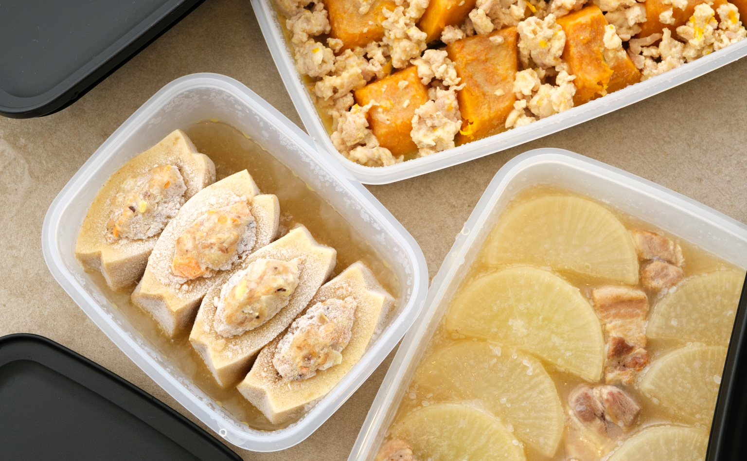 火が通るのに時間がかかる根菜類はあらかじめ加熱してから冷凍するのがおすすめ。特にかぼちゃや大根など、煮ると形が崩れやすい食材はコンテナ型の保存容器に入れる方が安心です。解凍するときは空気弁を開けて、600Wで3~5分程度温めてください。電子レンジの機種によって特徴が異なるので、様子を見ながら調整してくださいね。