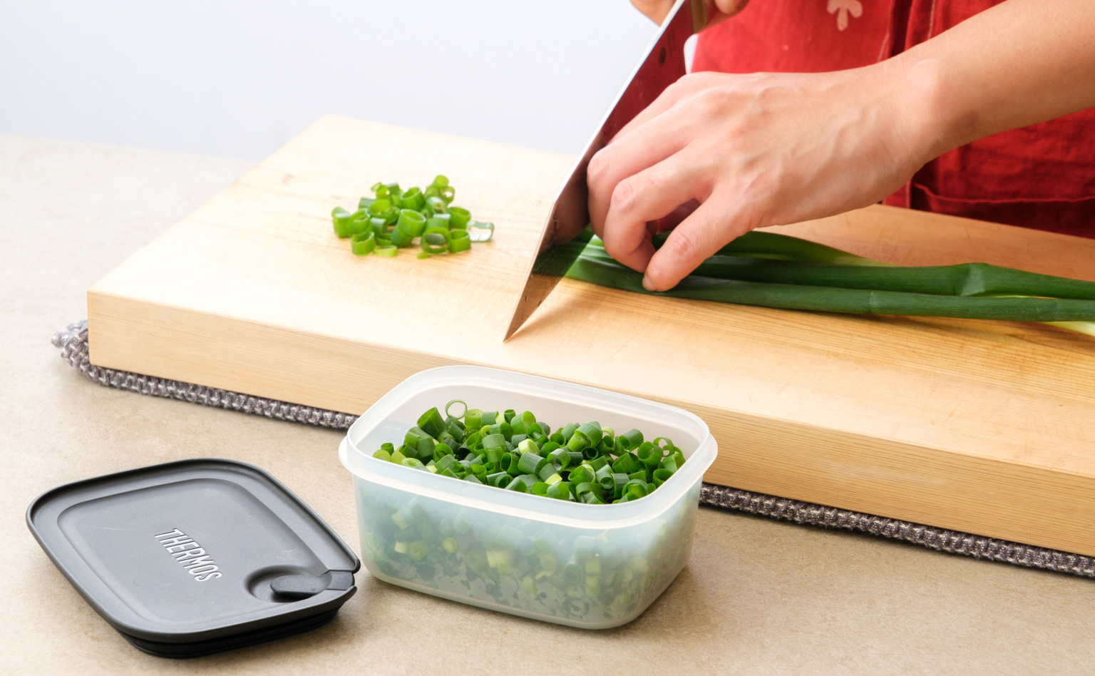 彩りや薬味などに出番が多い青ねぎは、刻んで冷凍する方も多いですよね。こうした細かい食材も保存容器に入れて冷凍がイチオシです。フリーザーバッグだと袋の壁面にくっついてしまい取り出しにくいことがありますが、容器だと使いたい時に使いたい分だけ取り出しやすいですよ。