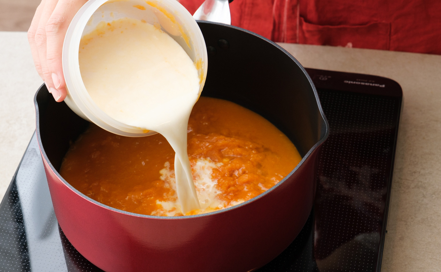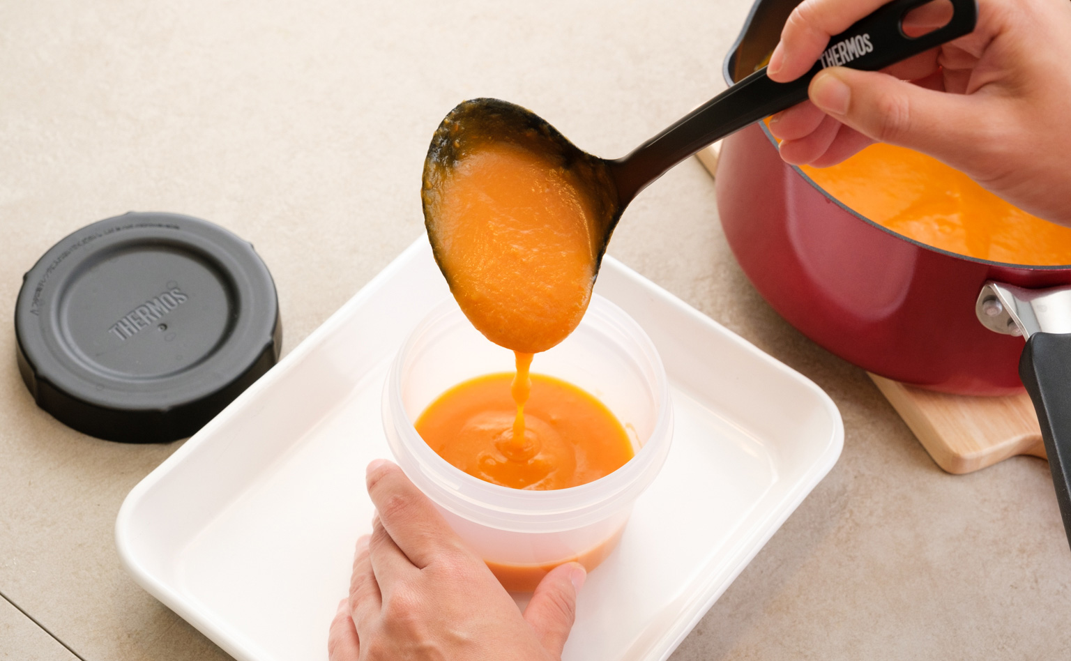 野菜が安く買えた時、私はよくポタージュの“もと”をよく作りますね。にんじん、玉ねぎ、セロリをみじん切りにして鍋で炒め、「ソフリット」という香味ベースを作ります。コンソメキューブや塩、コショウを加えてブレンダーなどでペーストにし冷凍保存。牛乳を入れて仕上げる一歩手前まで作ってしまうんです。ソフリットにプラスして、じゃがいもやとうもろこし、かぶやきのこなど、いろいろな野菜で作っています。冷凍庫での保存期間はおよそ1か月。使う時は半解凍で容器から取り出し、牛乳や豆乳などお好きなものでのばして加熱してくださいね。