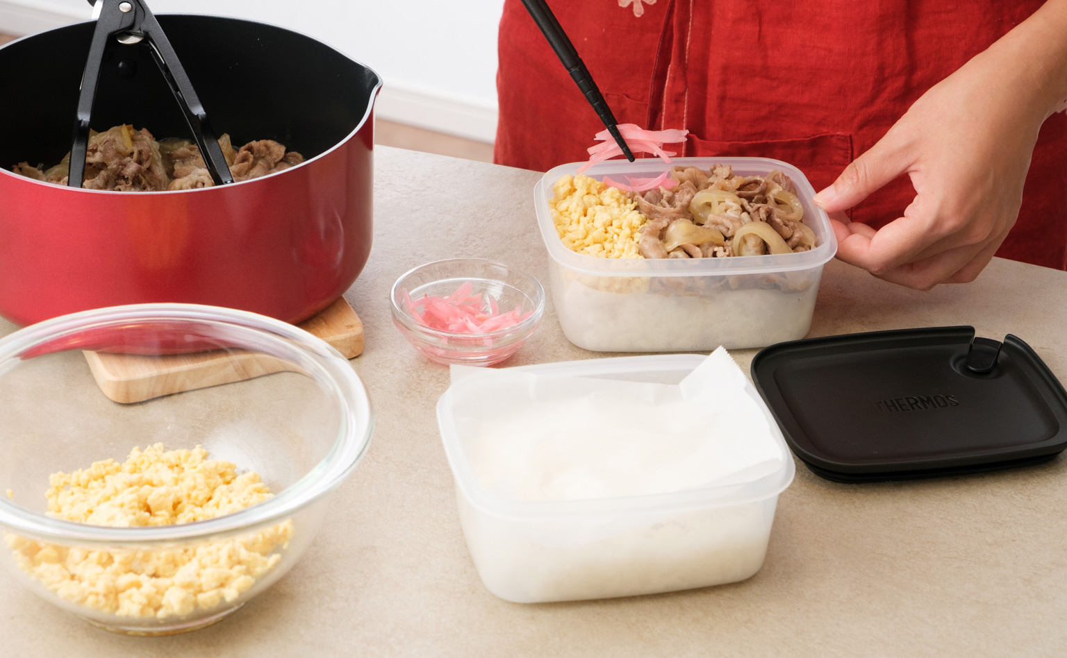いろいろなおかずを詰め合わせたお弁当を冷凍すると、やはりどうしても温めムラが出てしまいます。なので私はこうした丼ものをおすすめしていますね。鶏そぼろ丼やチンジャオロース丼など、水分が少ないおかずがいいですね。例えば「夜ごはんに作ったしょうが焼きが少し余ってしまった」という時に、ごはんと組み合わせて冷凍弁当にしておくと便利ですよ!