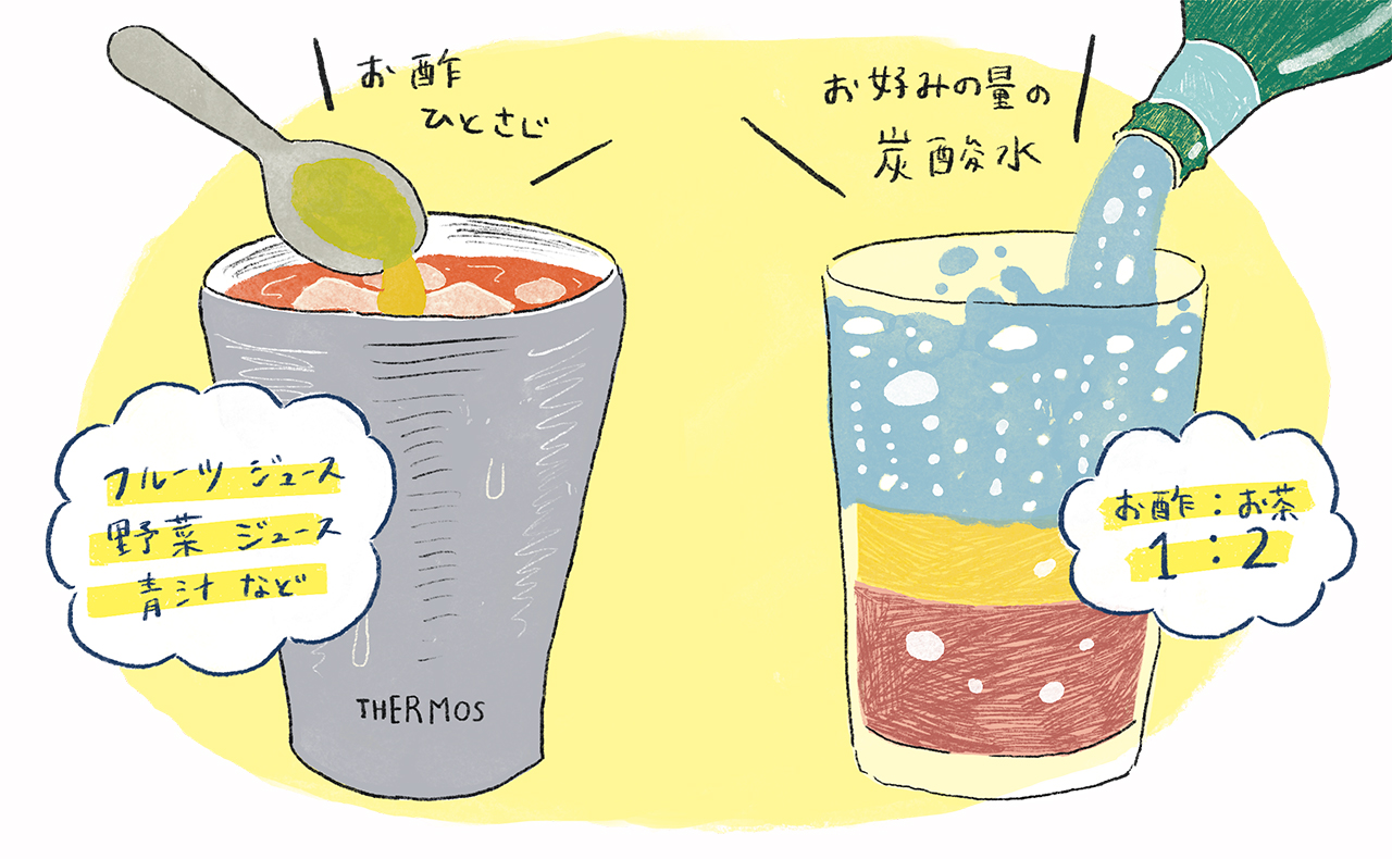 フルーツジュースや野菜ジュース、青汁に入れるのもおすすめです。コップ1杯(200ml)あたり、大さじ1杯(ひとさじ)のお酢が目安です。量は好みに応じて調整してください。