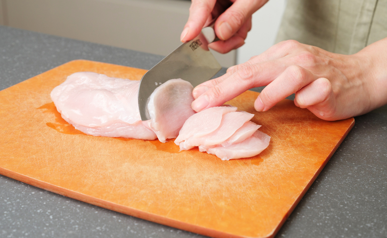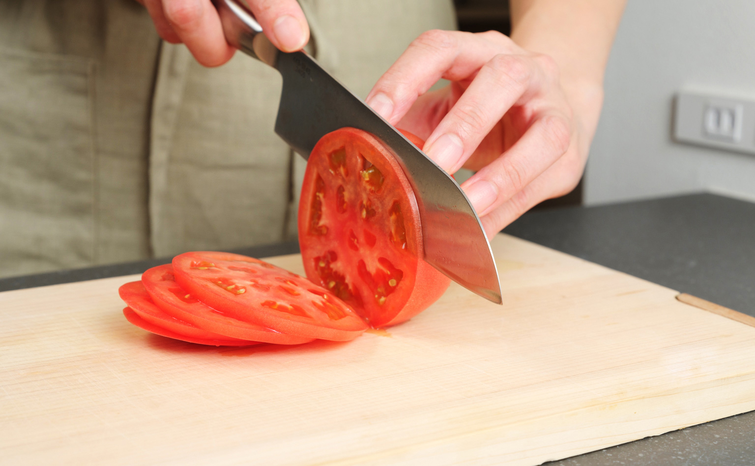 今回はトマトと鶏肉を選びましたが、どちらも薄くカットできました。切れ味が良く、思った通りに切れるのでストレスを感じません。スパッと切れると断面もキレイに仕上がりますし、気持ちいいですね!