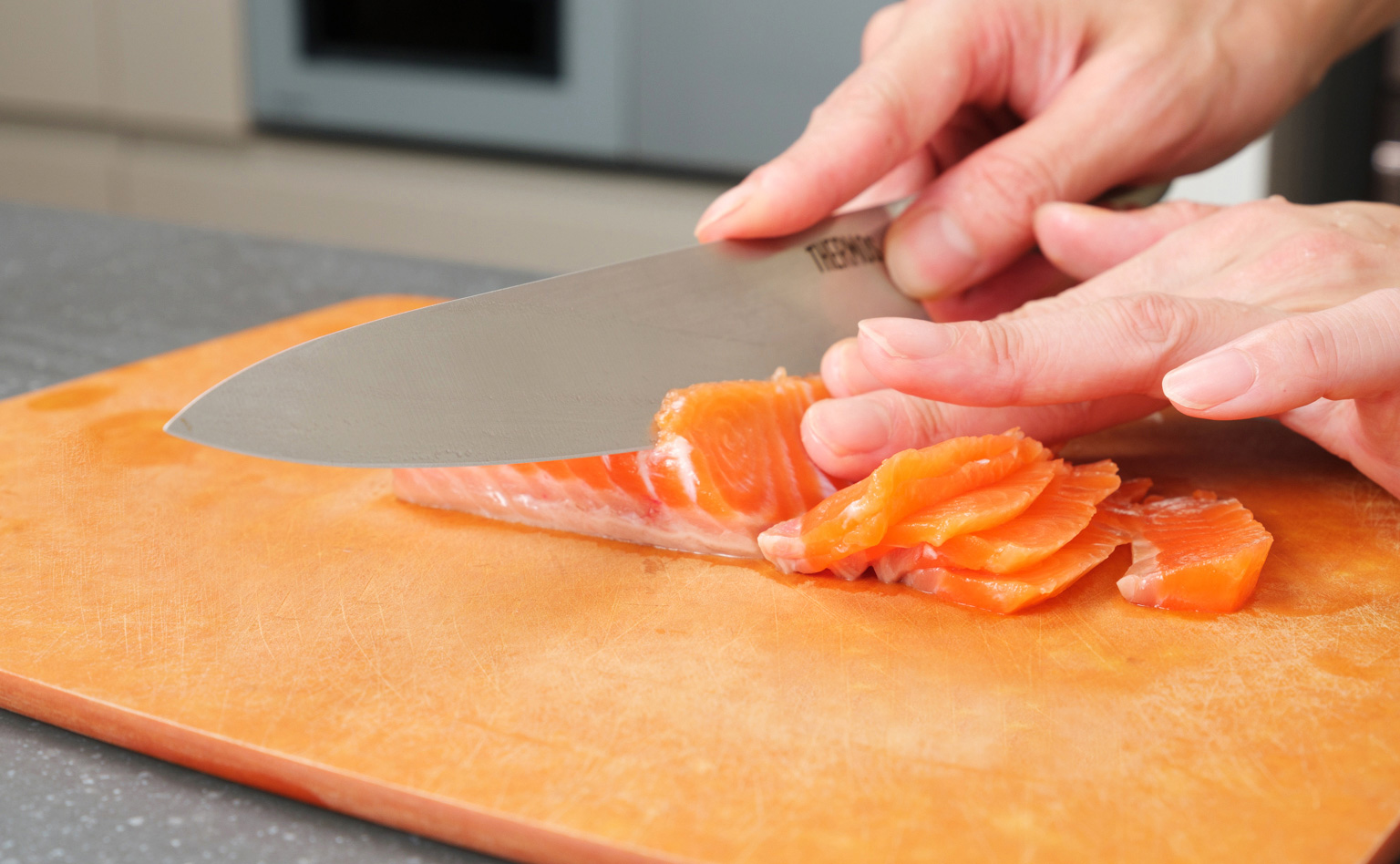 刺身用サクの場合、牛刀の根元から刃先までの長さを利用してスッと引くように切るとうまくいきます。サーモスの包丁は切れ味が良いので、慣れていない方でも切りやすいのではと感じました。お刺身の断面がなめらかだと、口に入れた時の舌触りも変わりますよ。