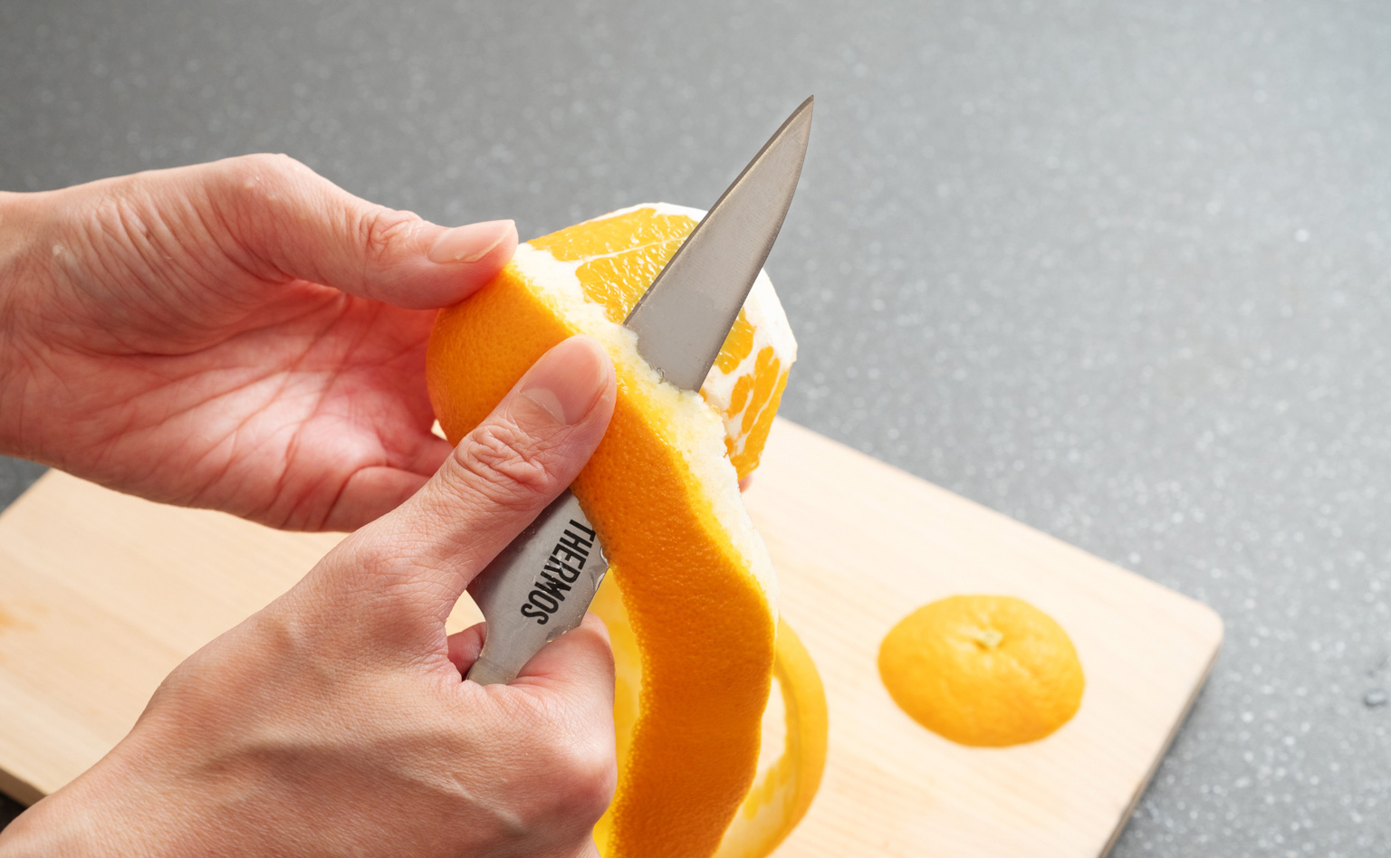 ペティナイフは一般的に12~15㎝程度の刃渡りが多いですが、サーモスのペティナイフは11.5㎝とさらに小さめです。今回はオレンジの皮むきと、玉ねぎのみじん切りを試していただきました。使ってみていかがでしょうか?