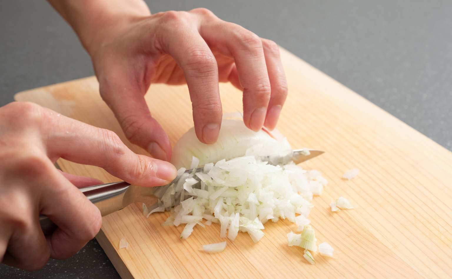 みじん切りなどの作業もペティナイフがあるとやりやすいですね。刃先が鋭いので細かくカットできますし、小さくて軽いので手が疲れにくい気がします。