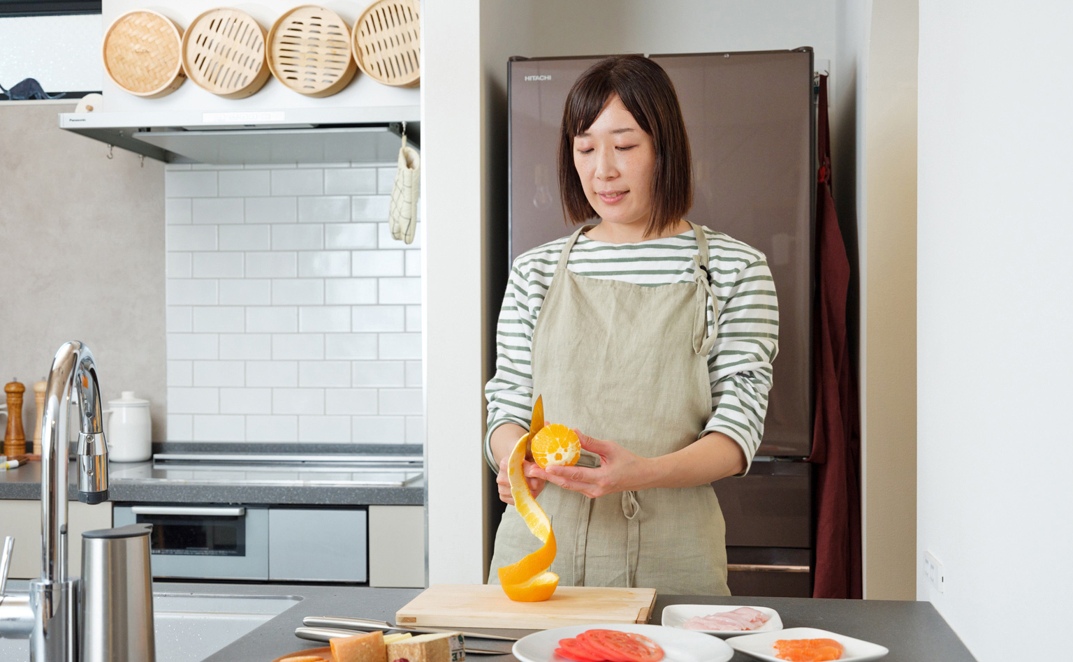 刃渡りが短くて幅がスリムなので、「こう動かしたい」という意識が伝わりやすく、いつも使っているペティナイフよりも細かな作業がしやすいように感じました。この時、持ち手のくぼみに指をかけておくととても安定します。オレンジの皮むきでは、白い薄皮と果肉部分の間にうまく刃先を動かすことができました。また、切れ味が良いからか、「いつもよりも果汁がこぼれないな」とも感じましたね。これは驚きました!