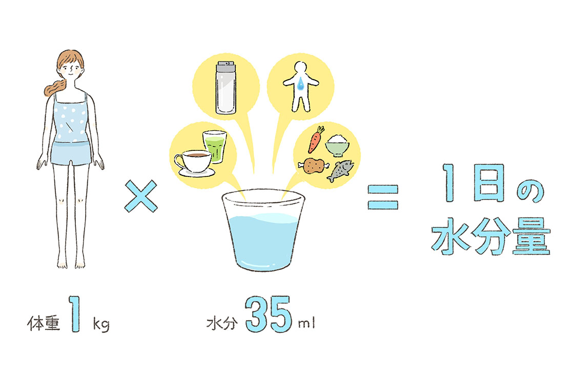 「もちろんです。今お伝えしたのは、あくまで汗をかいていない状態の基準。人間は、汗をかいていなくても、呼気や皮膚の表面から常に水分が蒸発し続けています。それらと、排泄物などで体から失われる水分をまかなうための必要量が、体重1kgあたり35ml程度とされています」