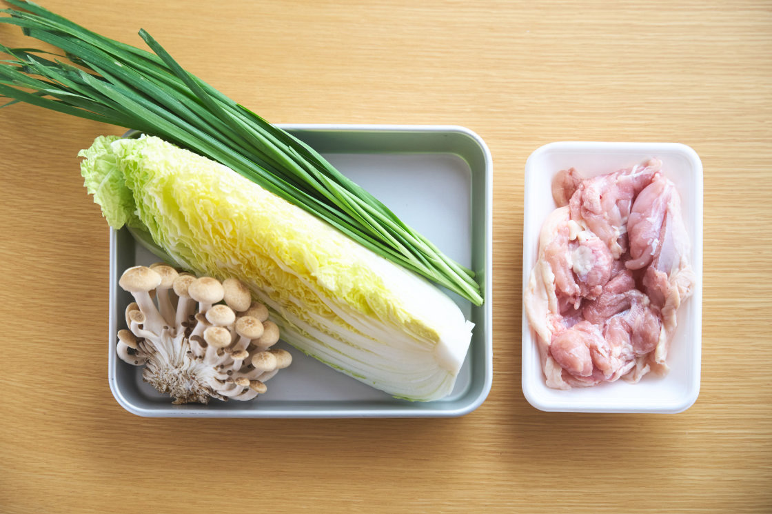 今回は鶏肉で作りますが、豚バラ肉や、鮭の切り身を代わりに入れてもおいしいですよ! お野菜も、冷蔵庫にあるもので好きにアレンジしてみてくださいね。キャベツや小松菜、長ネギなんかはキッチンバサミでも簡単に切れるので、お鍋の具材におすすめです!