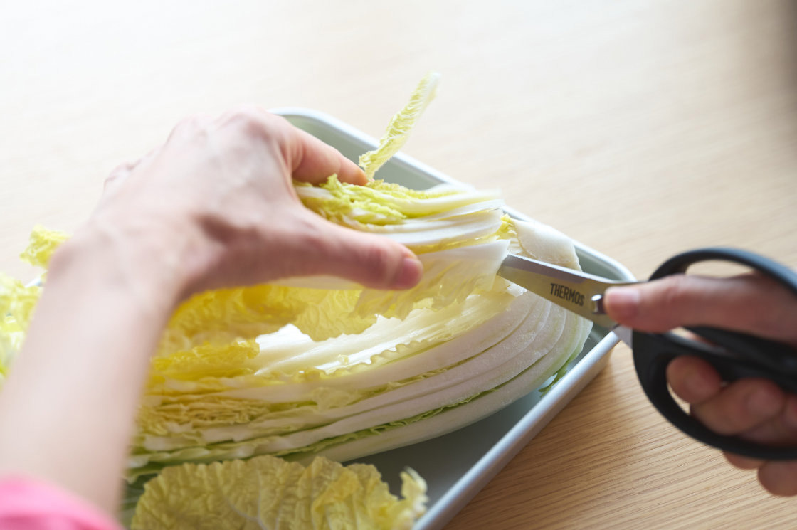 まずは白菜の根本をキッチンバサミで切り離します。芯の硬い部分はキッチンバサミでカットし、柔らかい葉の部分は手でちぎってしまいましょう。手でちぎると、断面がギザギザになって味が染み込みやすくなりますよ。ほかの野菜を使う場合でも、硬い部分はキッチンバサミで、柔らかい部分は手でちぎるのをおすすめします。
