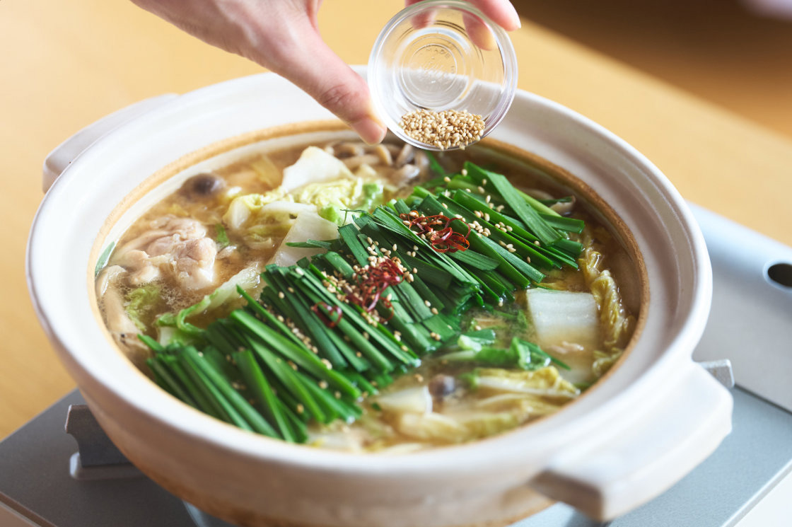 ニラはすぐに火が入るので、最後に鍋へ加えて、食べる前にひと混ぜするだけでOKです。最後に白ごまと唐辛子を乗せて、完成です!