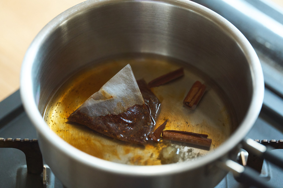 ルイボスだけでもよいですが、スパイシーさが好きな人は、このタイミングでおろししょうがとシナモンスティックをプラスしてみてください。片方だけでも問題ありません。体が温まる、冬にぴったりなドリンクになりますよ。シナモンスティックは、少し折って入れると香りが強くなります。