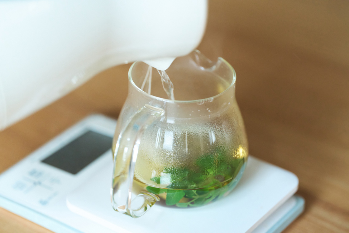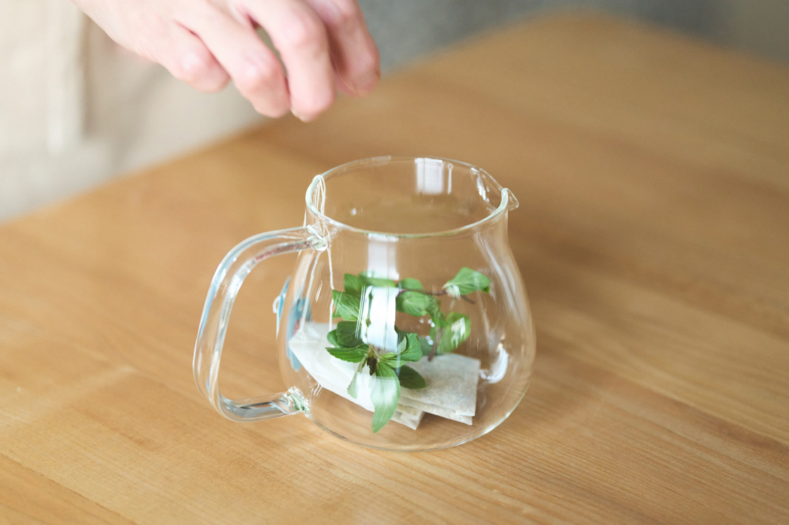 【1】ティーポットにカモミール、お好みでフレッシュミントを入れ、沸とうしたお湯を注いで5分蒸らす。
