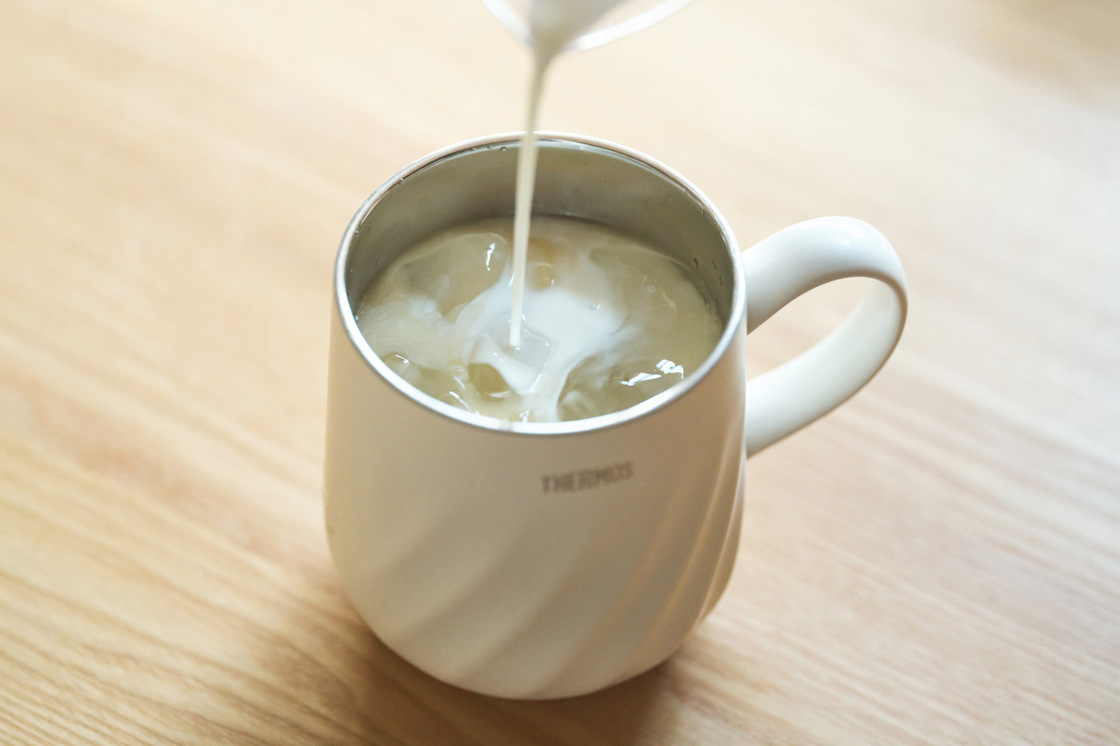 【3】冷たい牛乳を注ぎ入れ、お好みでガムシロップを加える。
