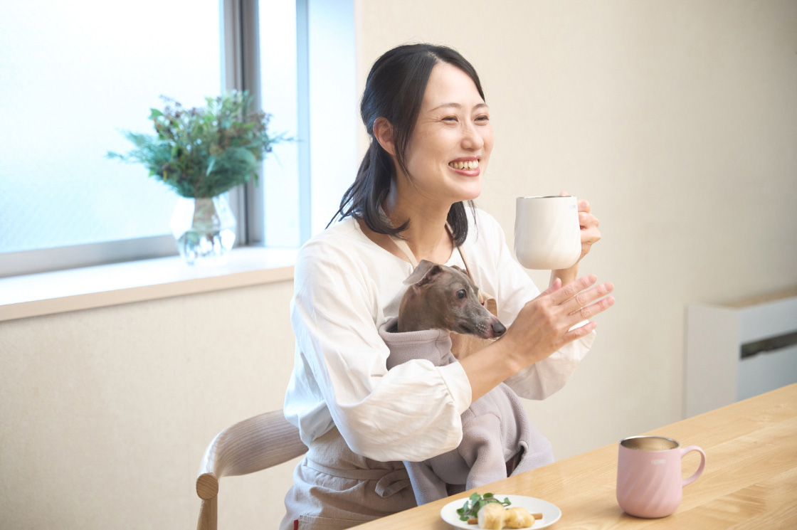 続いて、アイスのカモミールミルクティーも一口。と、そのとき、愛犬のディルくんが若井さんの膝の上に飛び乗ってきました。おいしそうな香りにつられたのでしょうか。