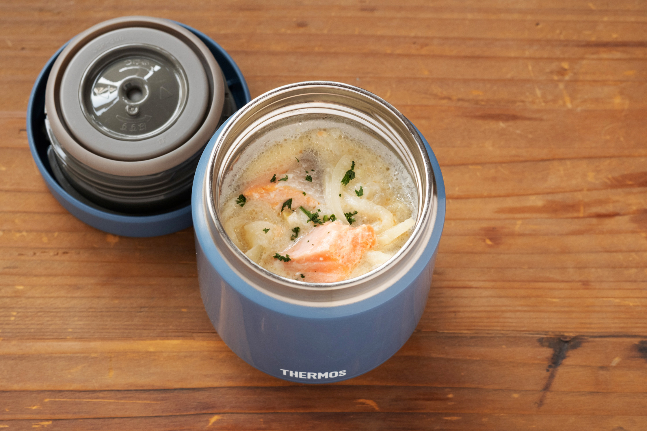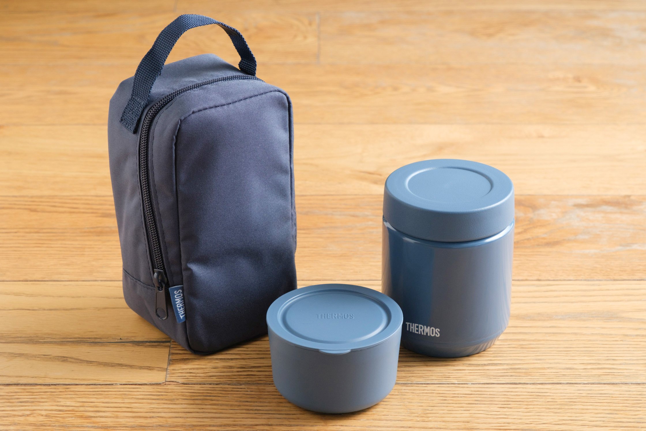 今回使用する「真空断熱スープランチセット」は、300mlのスープジャーと、250mlの容器に断熱構造の専用ポーチが付いたランチセットです。食洗機対応で、容器はフタを外せば電子レンジ加熱もできます。
