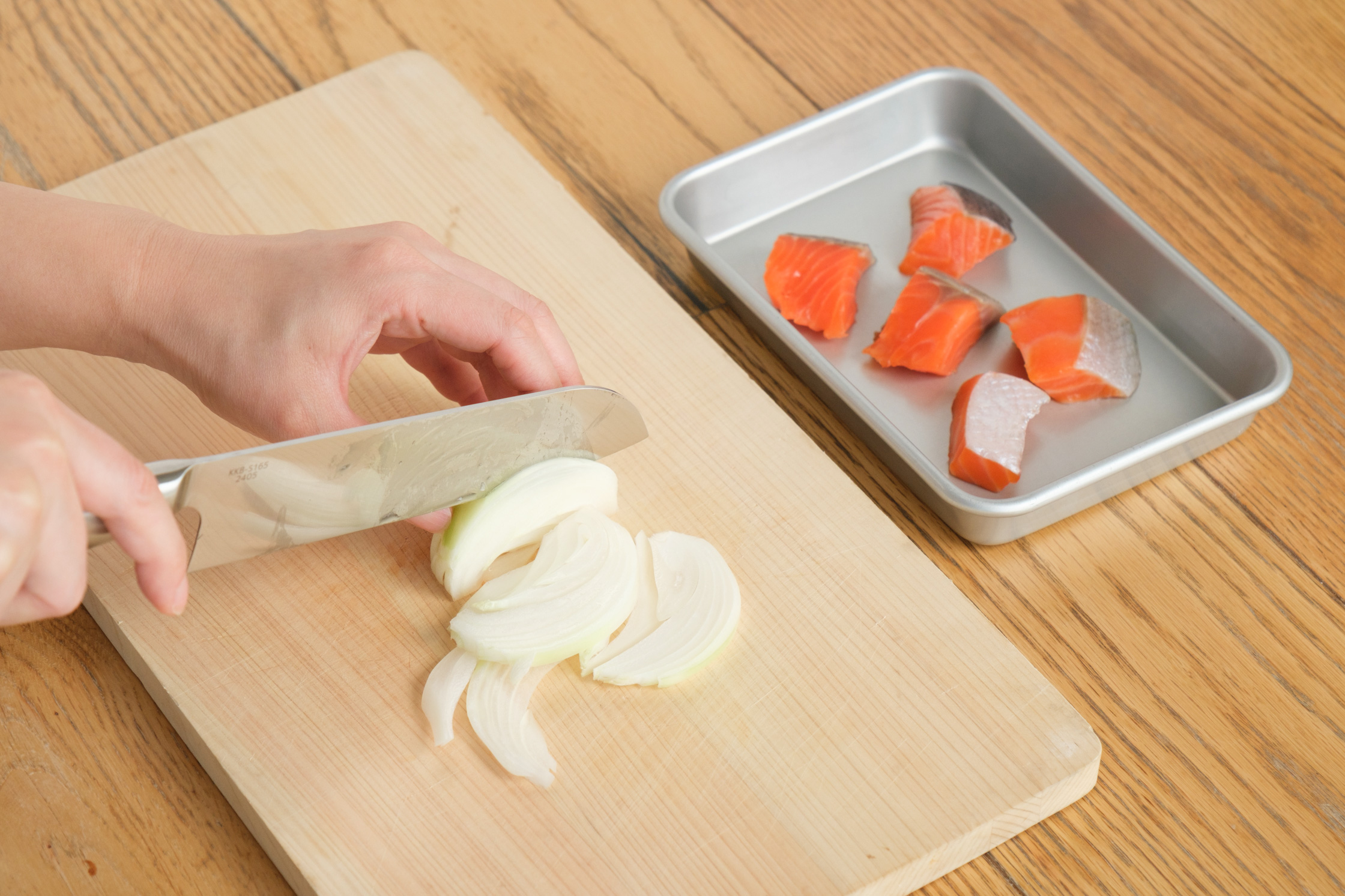 【1】玉ねぎは薄切りにし、生鮭切り身はひと口大に切る。パセリは刻む。