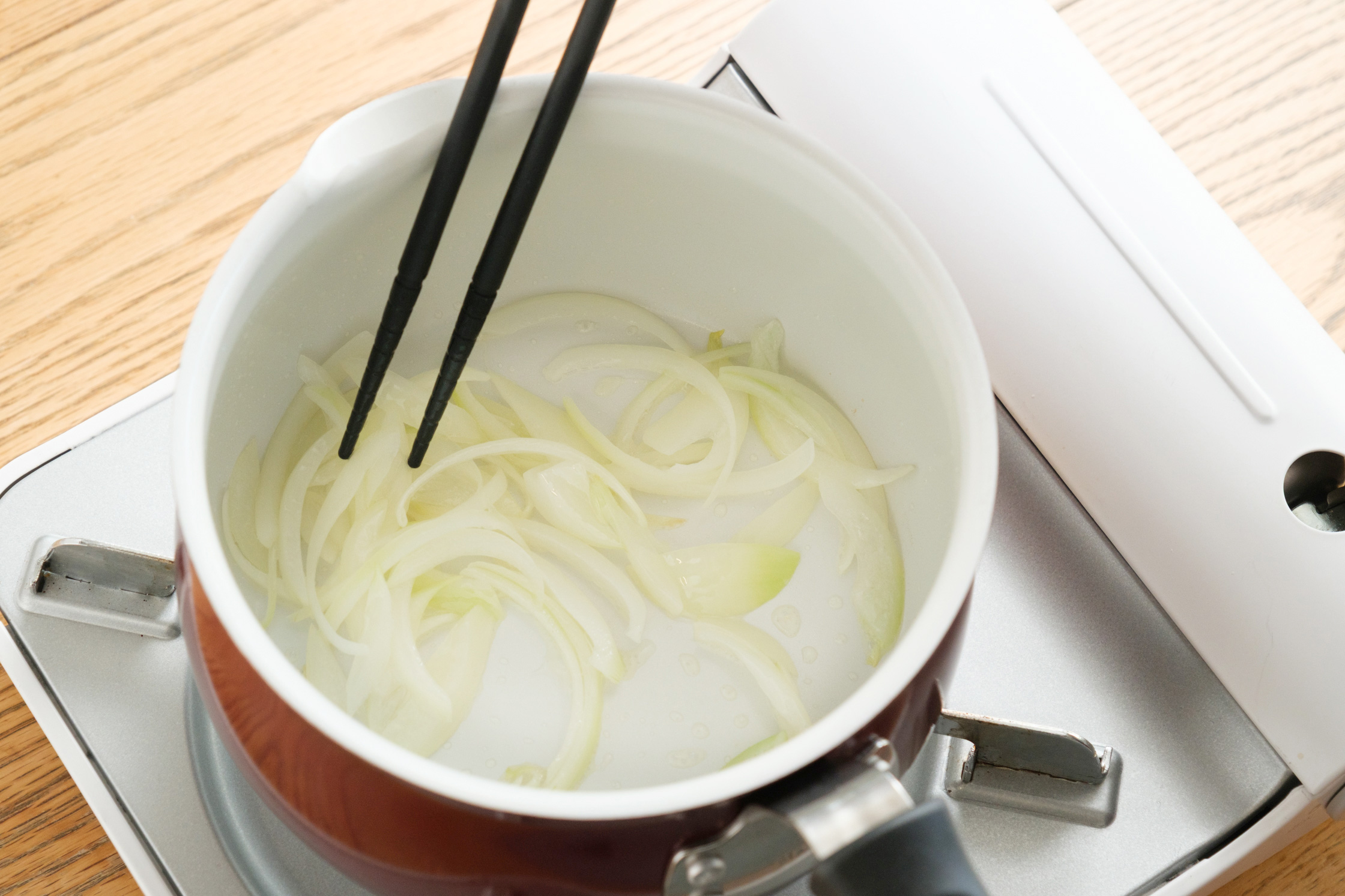 【2】鍋に米油を入れて中火で熱し、玉ねぎを加えてしんなりするまで炒める。