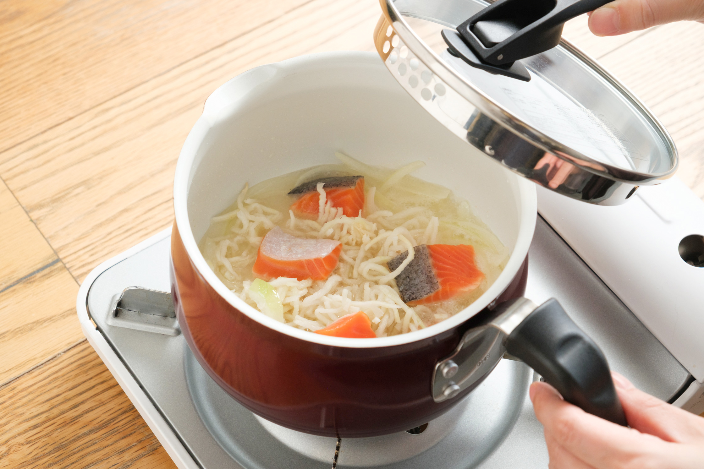 【3】切り干し大根と戻し汁、生鮭切り身、酒を加えてフタをする。弱めの中火で3分加熱する。