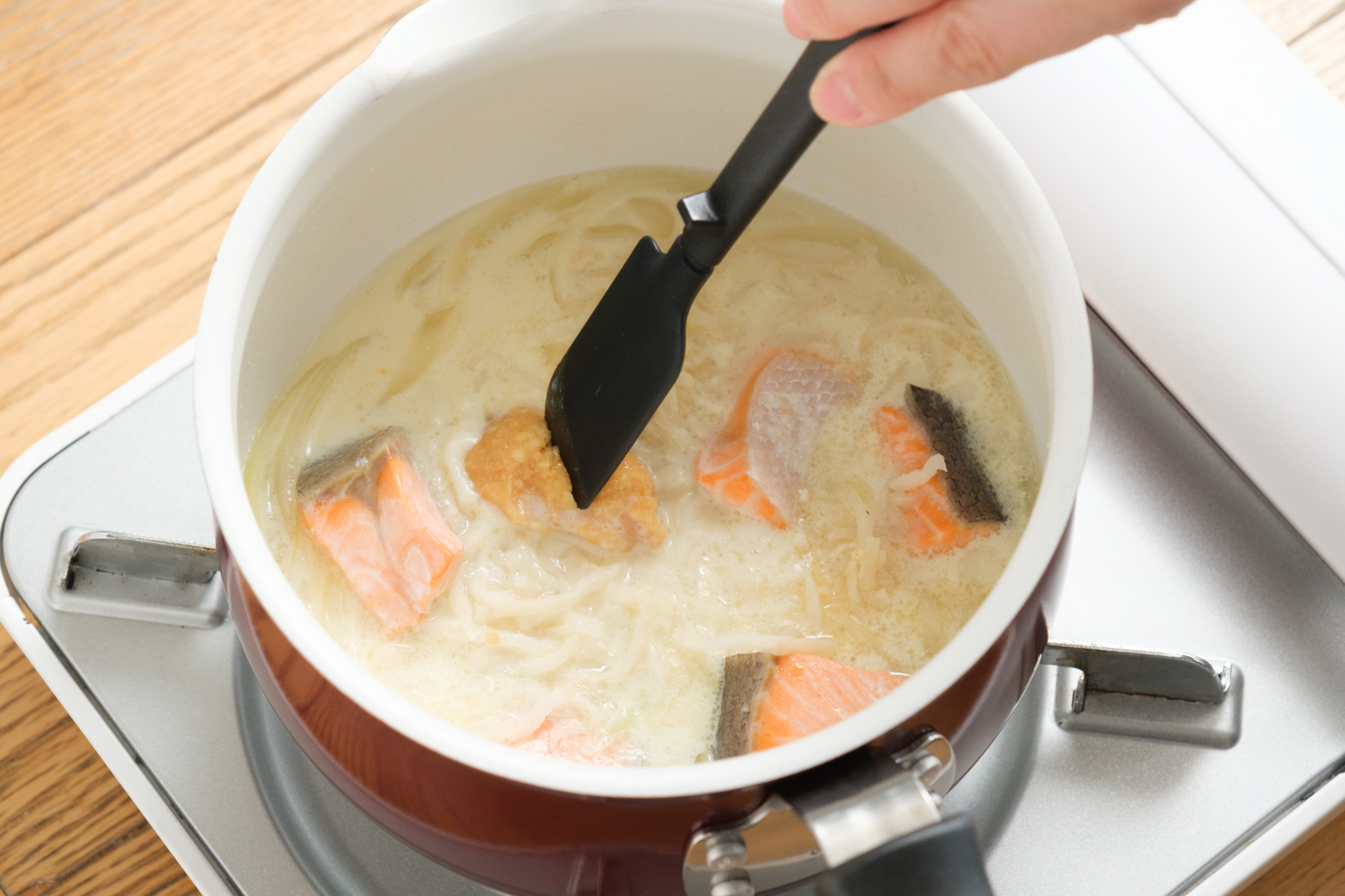 食物繊維とたんぱく質が一緒にとれる「鮭と切り干し大根の豆乳味噌スープ」