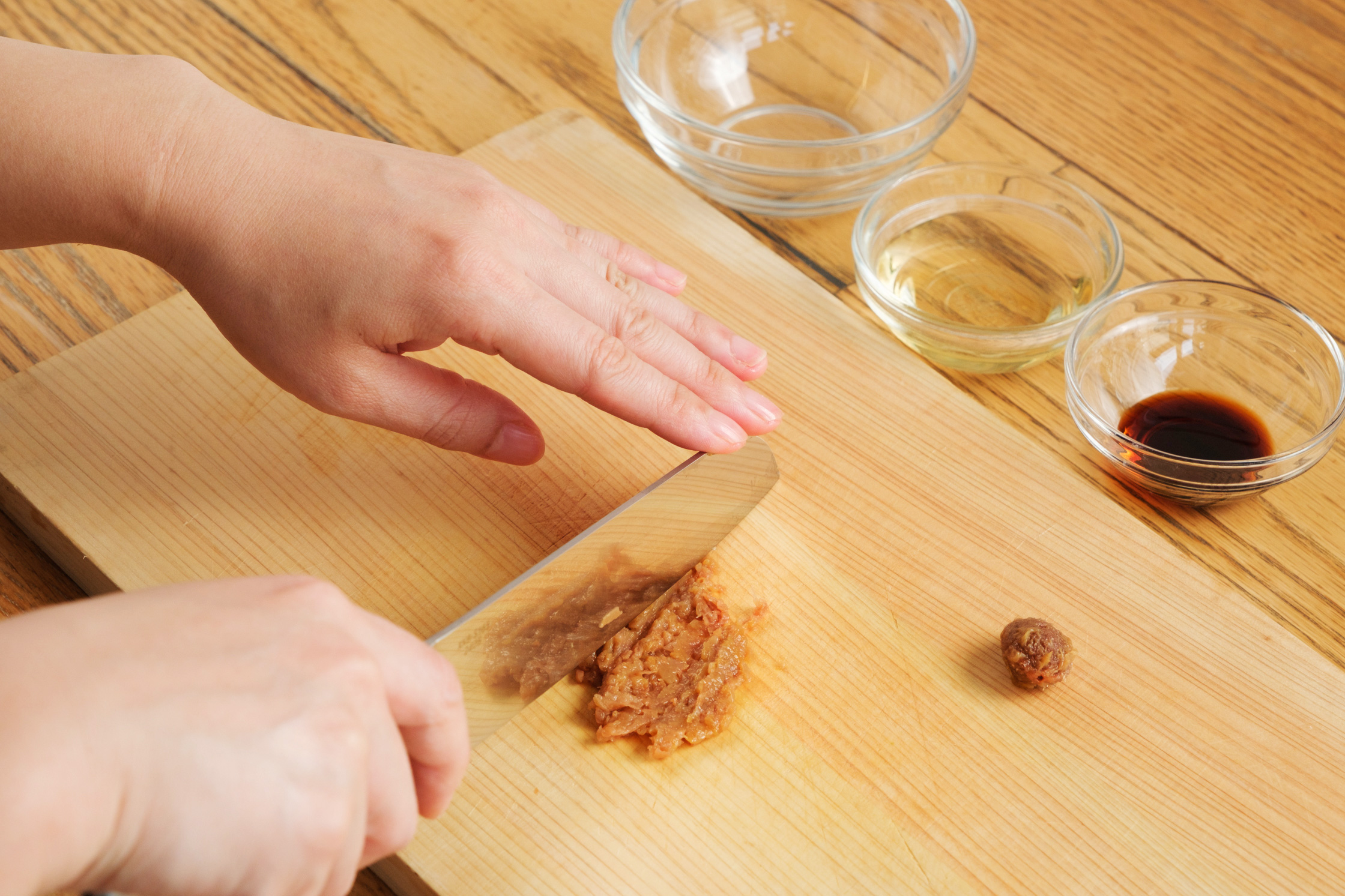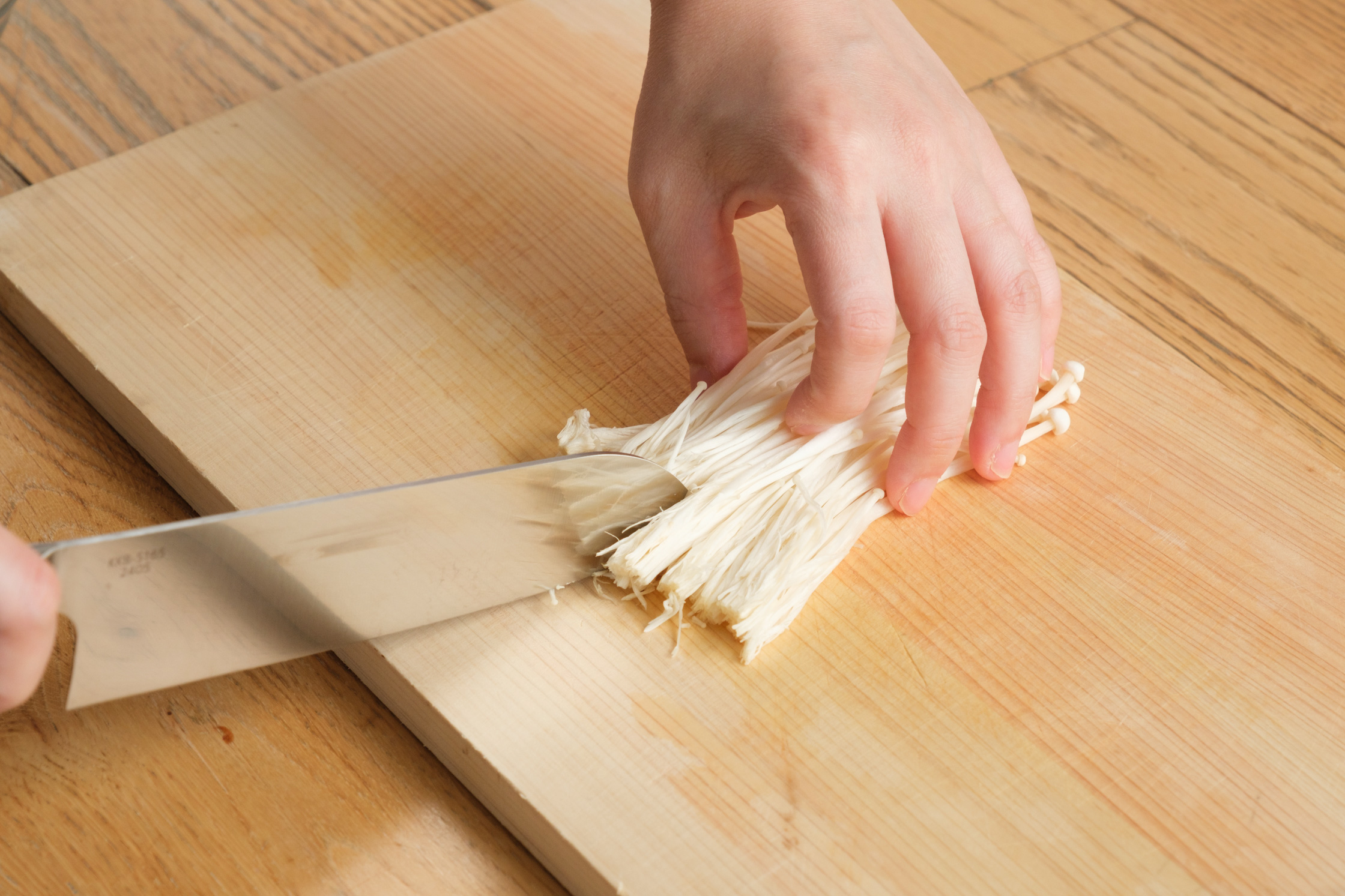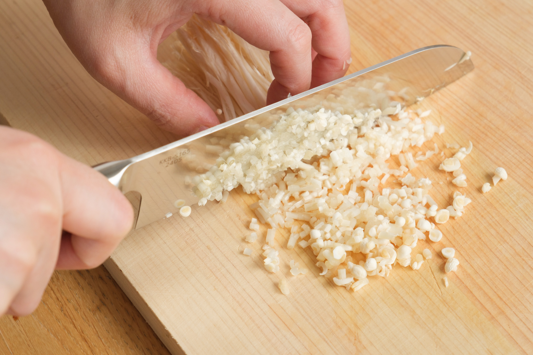 えのきをみじん切りにする時は、先に根元に何本か切り込みを入れ、その後にカサ(頭側)から細かくカットしていくとほぐれやすいです!