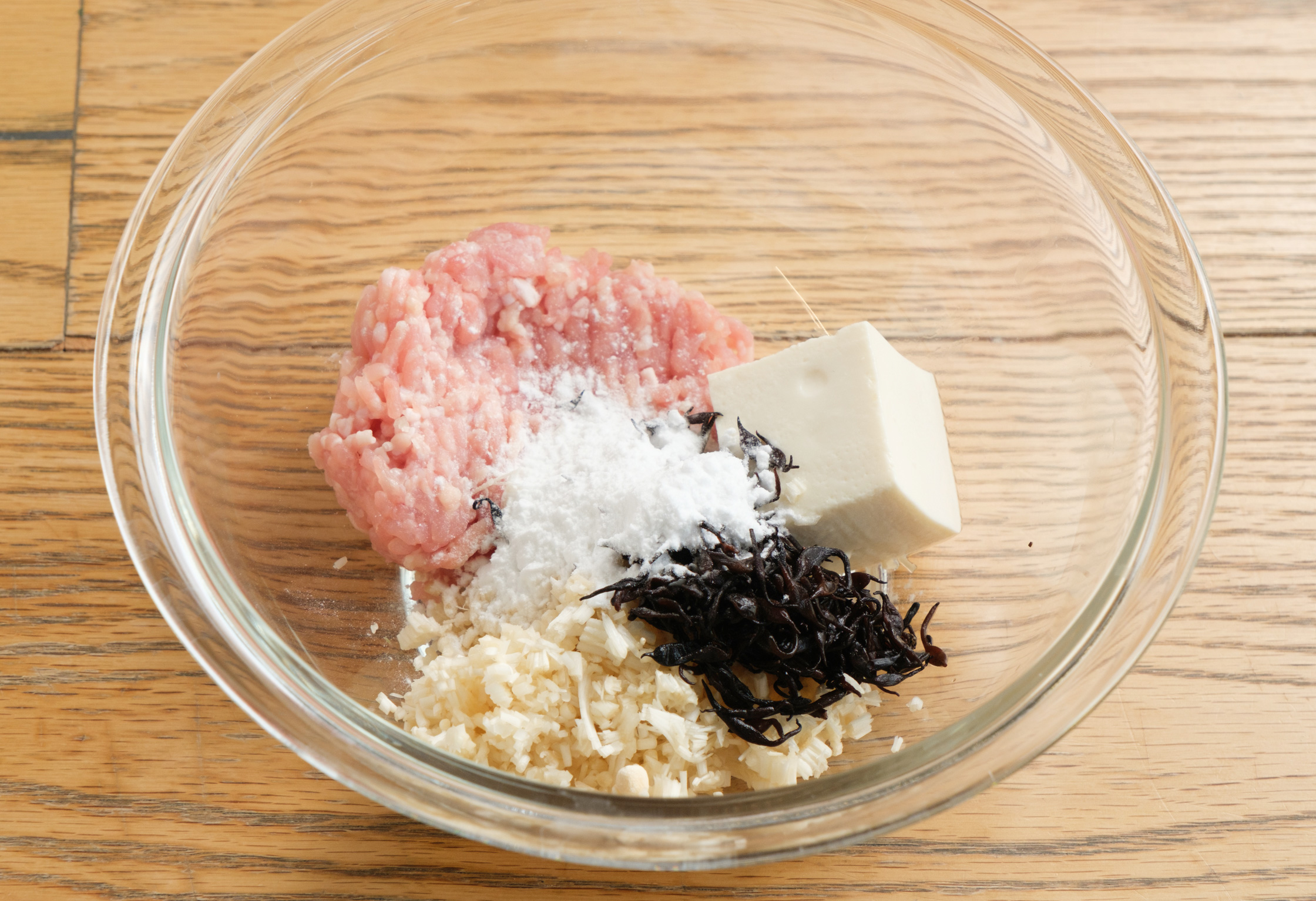 【2】ボウルに鶏ももひき肉、戻したひじき、えのき、絹豆腐、片栗粉を入れてよく混ぜ合わせる。4つに分けて小判の形に丸める。