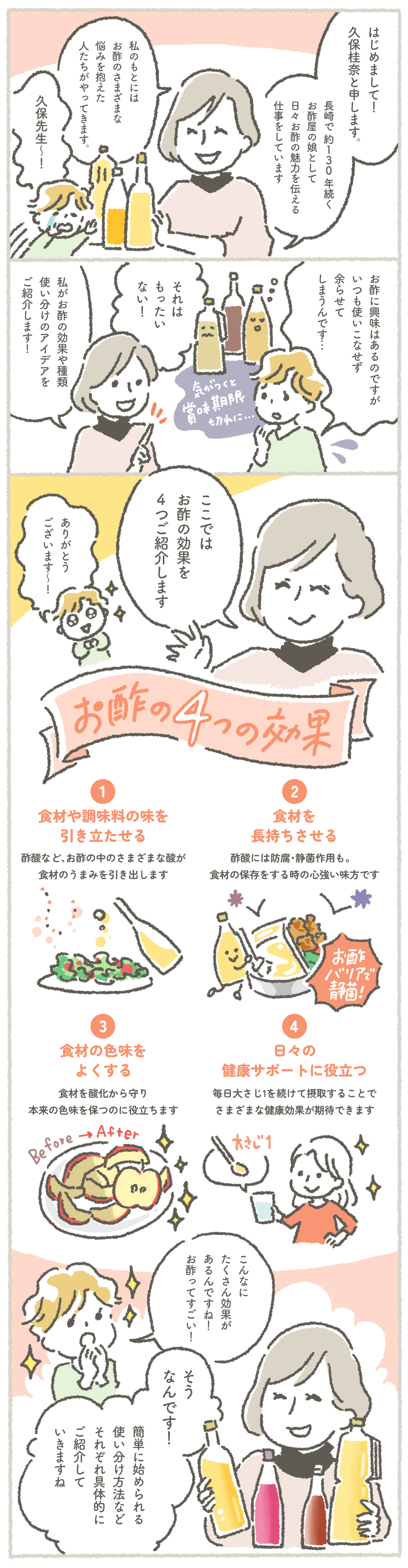 多くの家庭に常備されるお酢ですが「酢の物以外にどう使うの?」「お酢の種類がよくわからない」と悩む人も多いのではないでしょうか。実は手軽に使えて、ヘルシーな食生活に役立つ便利なアイテムなんです。今回は、お酢生活研究家の久保桂奈さんに、お酢の簡単な使い方を教えてもらいました。