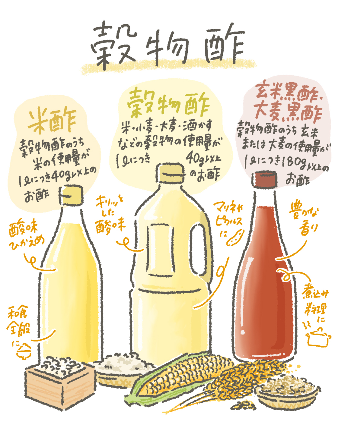 「穀物酢」は米、小麦、大麦、酒かす、コーンなど複数の穀物を使用したお酢です。比較的酸味が強めで、さっぱりとしたマリネやピクルスなどに向いています。