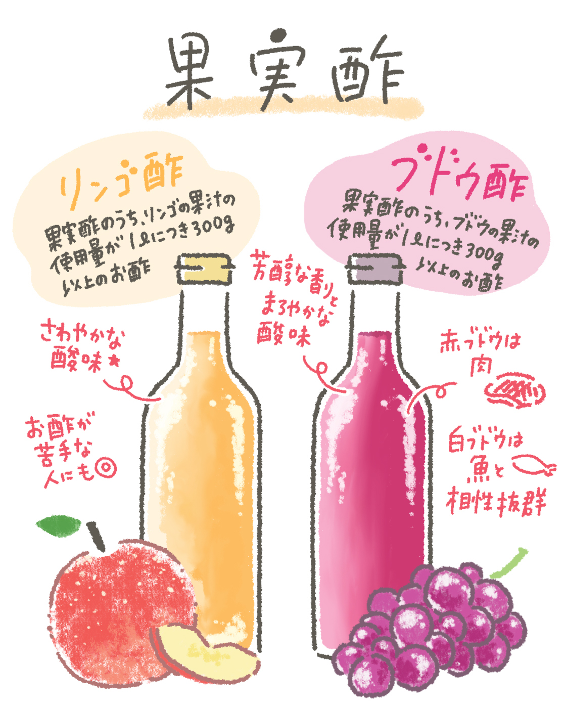 お酢は穀物や果実などを原料とするアルコールを酢酸菌の働きによって発酵させて造られるため、世界中に多種多様なお酢があります。大きくは「穀物酢」と「果実酢」に分けられ、原料や製法、熟成期間の違いによって、香りや味わいに個性が生まれます。