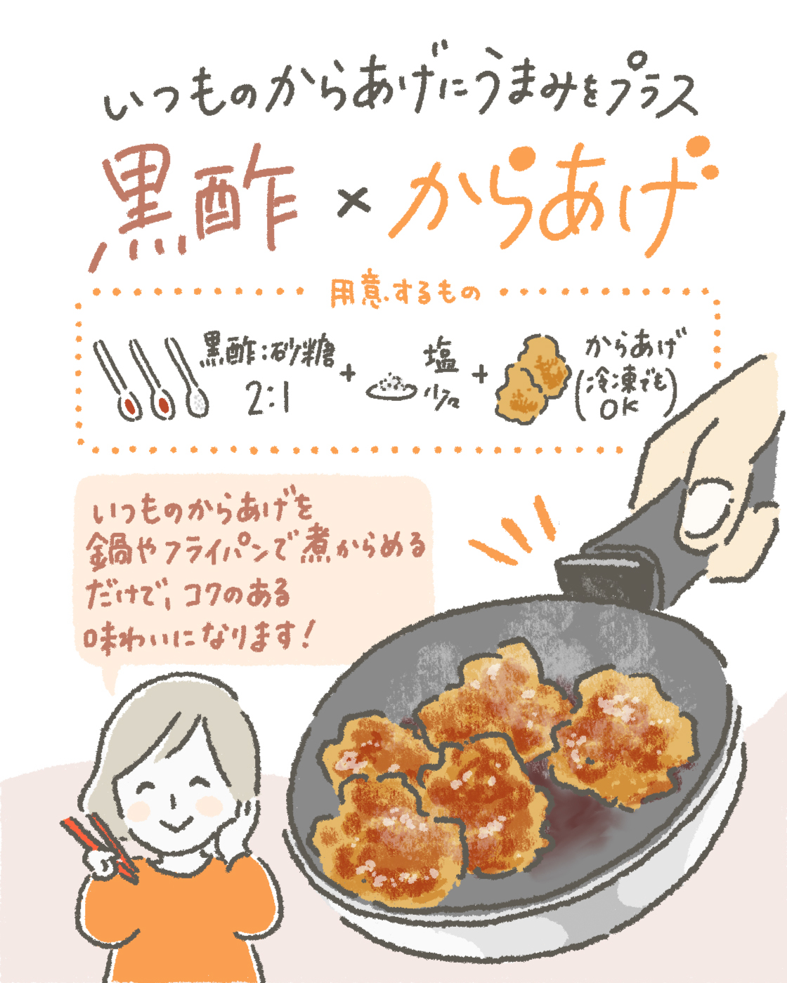 食卓の定番・からあげが黒酢でさらにおいしくなるアレンジをご紹介します。鍋やフライパンに黒酢2:砂糖1、塩少々を煮立たせ、そこにからあげを入れてまんべんなく煮からめるだけ(分量はからあげの量に応じて適宜調整してください)。油っぽさも抑えられて、冷めてもおいしく食べられます。