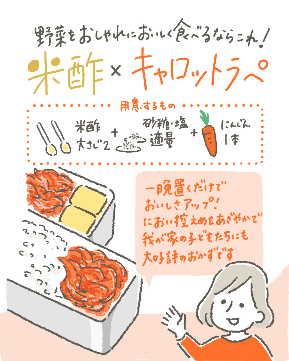 お酢を使った常備菜としておすすめなのがキャロットラペ。にんじん1本をピーラーなどで薄く削り、米酢大さじ2杯程度と、砂糖と塩を回しかけて5分ほど置き、しんなりしたらできあがり。